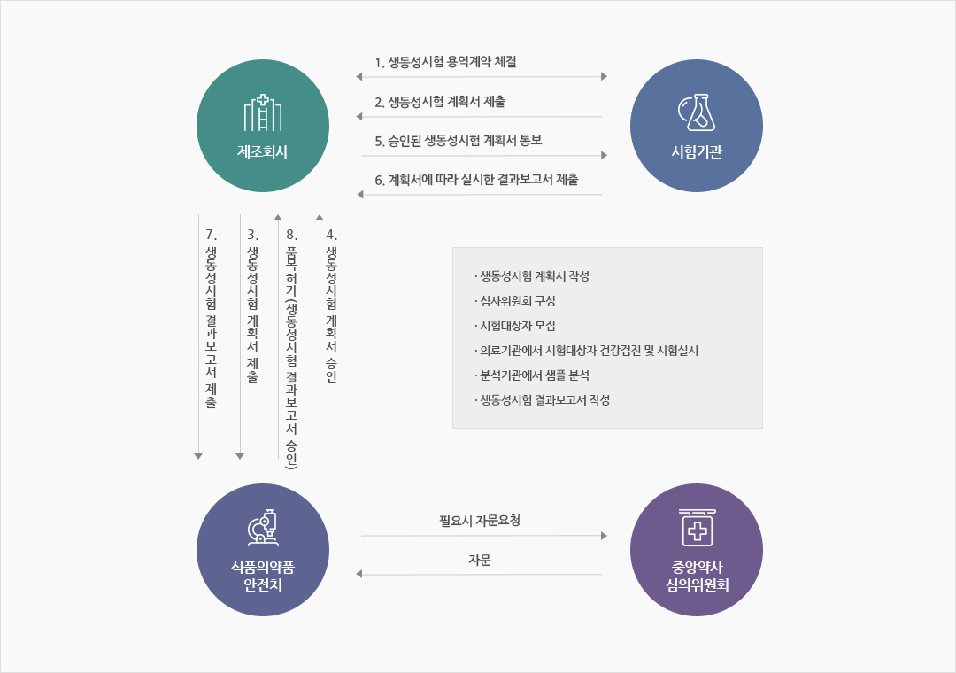 > 연구원이용안내 > 임상시험소개 > 생물학적동등성시험 소개생물학적 동등성 시험은 생동성 입증을 위하여 실시하는 생체내 시험의 하나로 주성분이 전신순환혈에 흡수되어 약효를 나타내는 의약품에 대하여 동일 주성분을 함유한 동일 투여경로의 두 재제가 생체이용률에 있어서 통계학적으로 동등하다는 것을 입증하기 위하여 실시하는 시험을 말합니다.