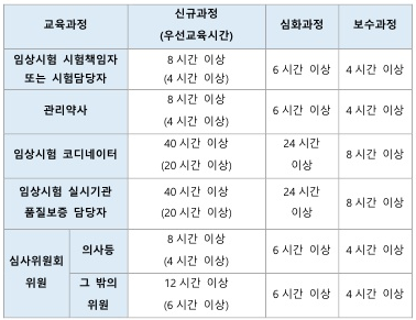 • 의사 등이 시험책임자・시험담당자 교육과정에서 이수 받은 교육시간은 심사위원회 교육과정에서 이수 받은 교육시간으로 보며, 반대의 경우도 동일하게 적용하여 인정됩니다.